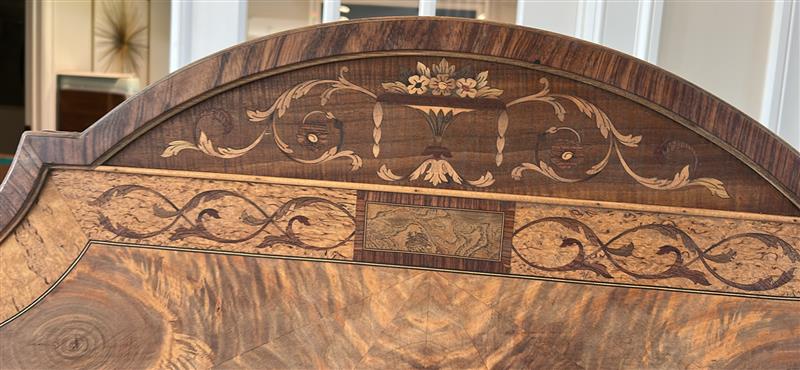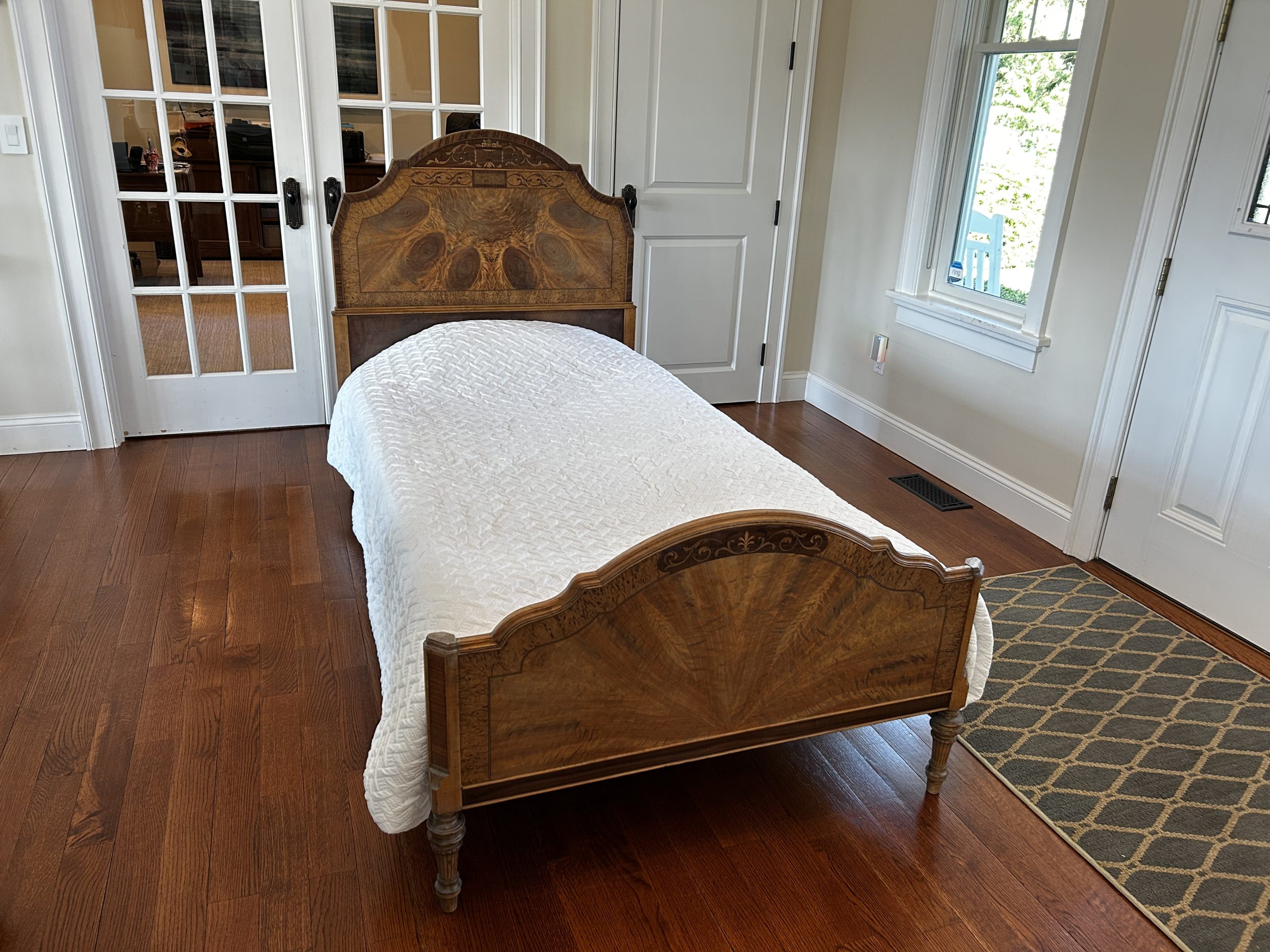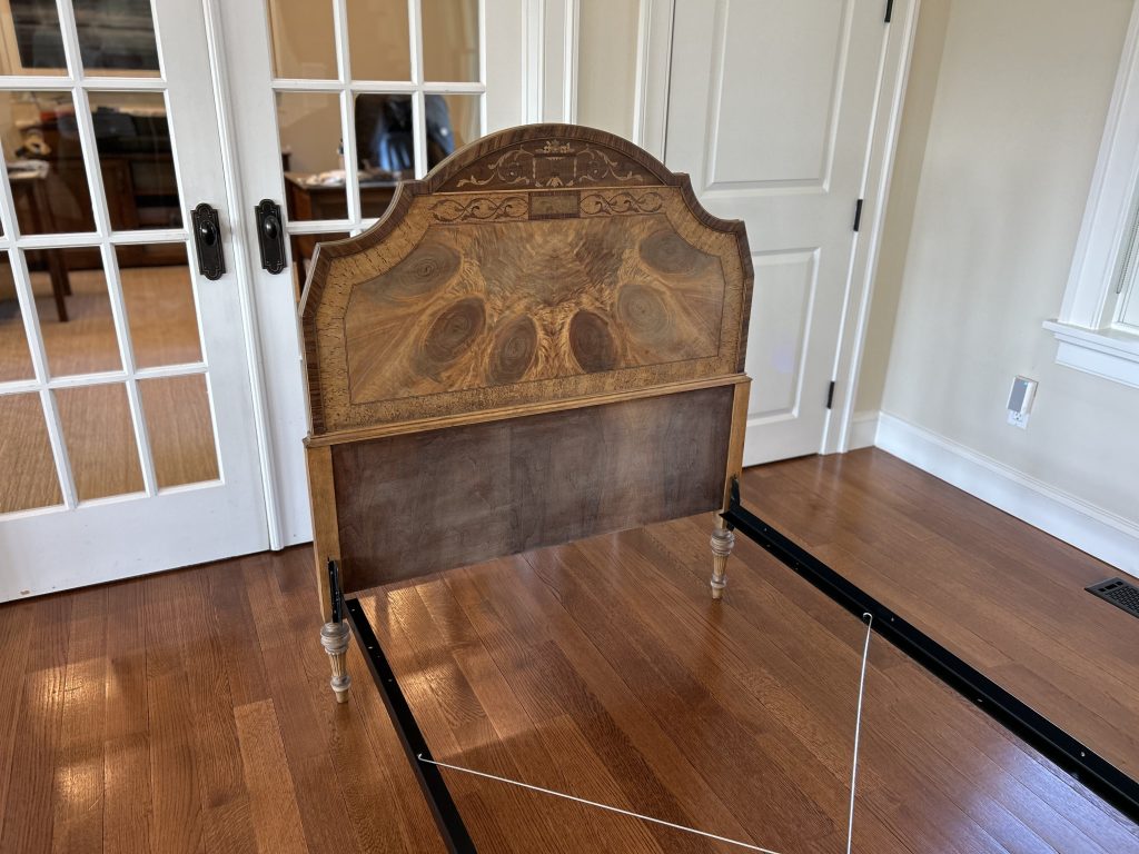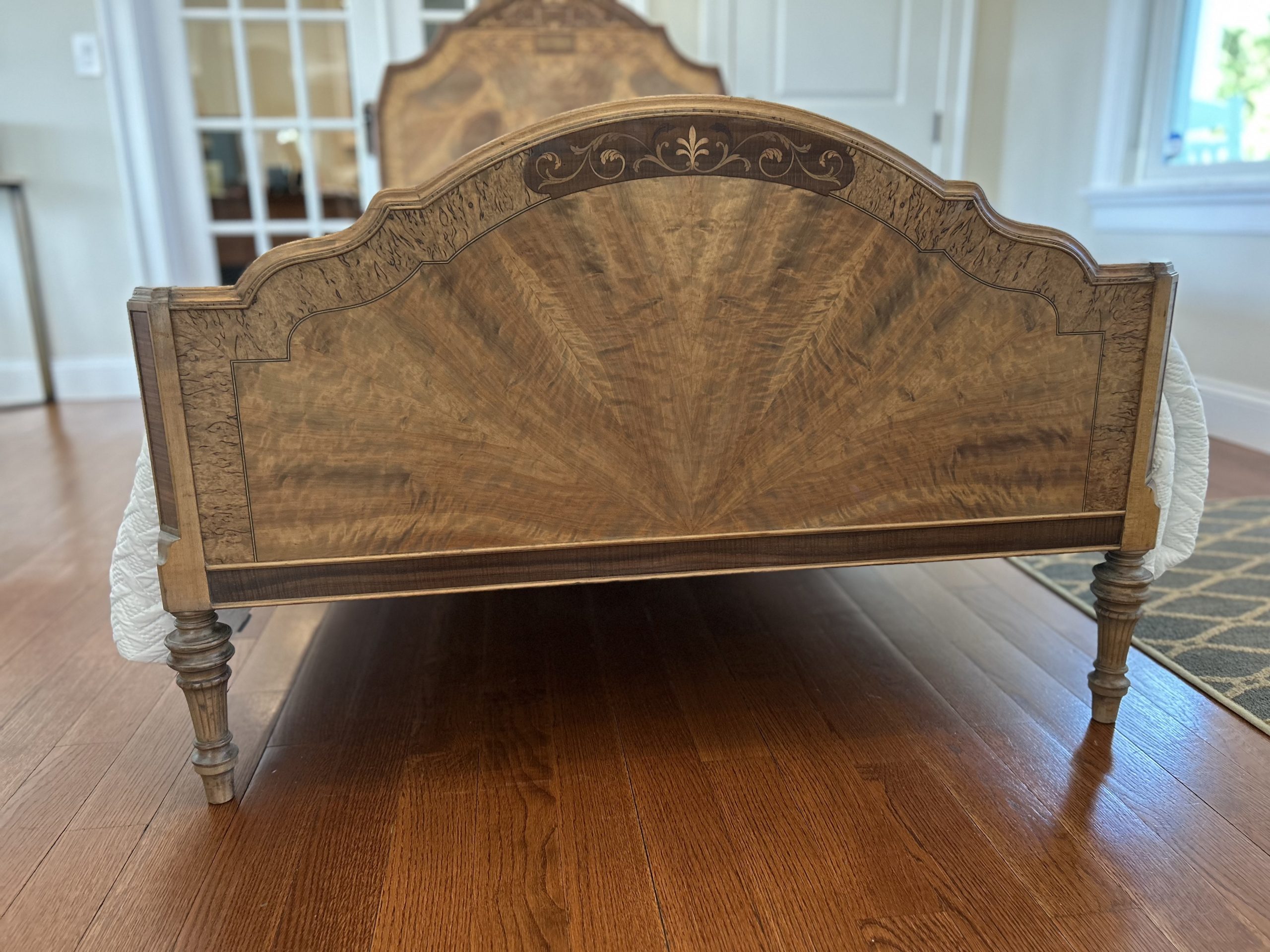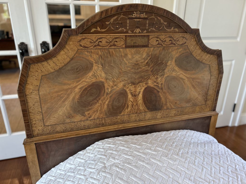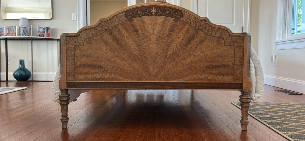 SOLD – This stunning vintage twin bed frame has been beautifully restored to showcase its original craftsmanship and timeless charm. The headboard and footboard feature intricate veneer detailing arranged in a dramatic sunburst pattern, enhanced by decorative trim and classic carved posts. The wood has been carefully refinished to highlight its natural tones and unique grain, bringing new life to this heirloom-quality piece. Sturdy, stylish, and full of character, this bed frame makes a gorgeous statement in a guest room, child’s room, or any space that celebrates classic design with modern refinement.